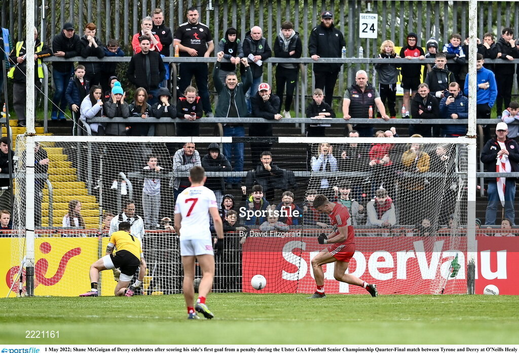 1 May 2022; Shane McGuigan of Derry celebrates after scoring his side's first goal from a penalty during the Ulster GAA Football Senior Championship Quarter-Final match between Tyrone and Derry at O'Neills Healy Park in Omagh, Tyrone. Photo by David Fitzgerald/Sportsfile