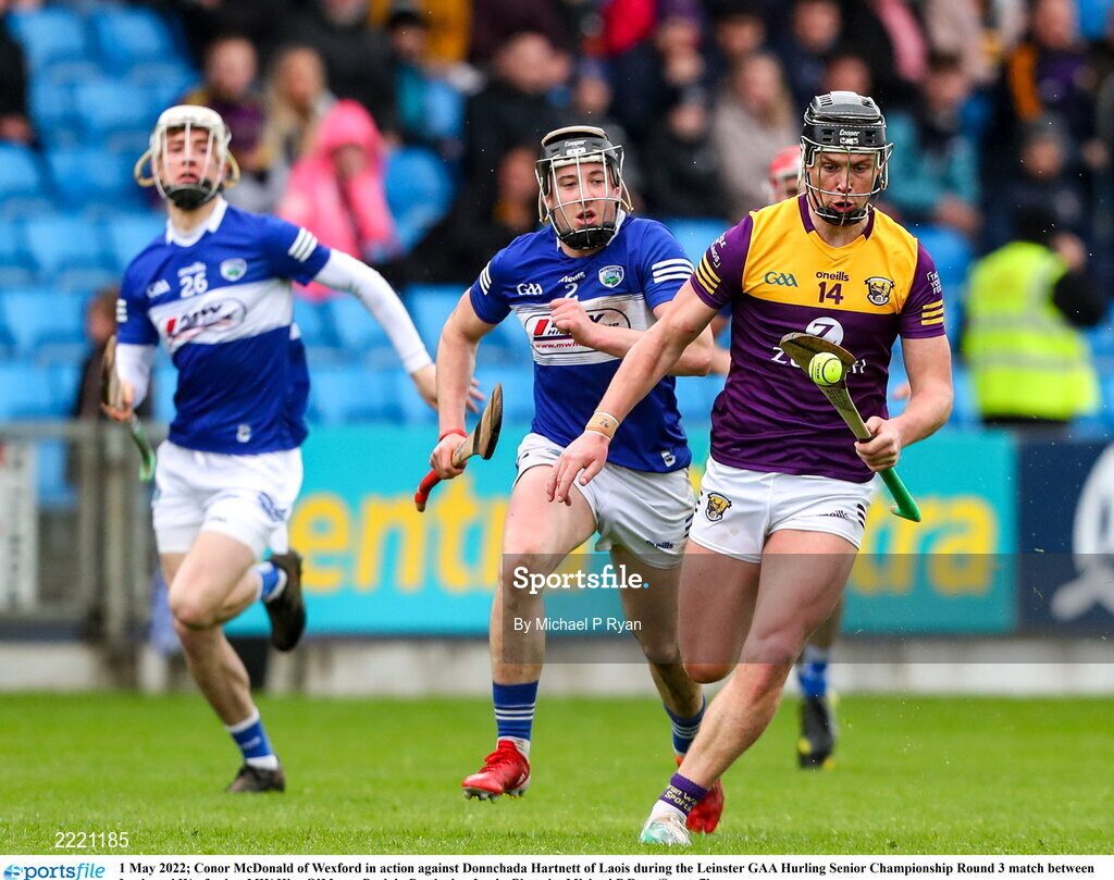 1 May 2022; Conor McDonald of Wexford in action against Donnchada Hartnett of Laois during the Leinster GAA Hurling Senior Championship Round 3 match between Laois and Wexford at MW Hire O’Moore Park in Portlaoise, Laois. Photo by Michael P Ryan/Sportsfile