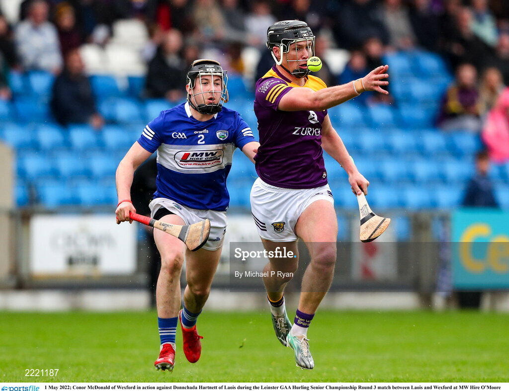 1 May 2022; Conor McDonald of Wexford in action against Donnchada Hartnett of Laois during the Leinster GAA Hurling Senior Championship Round 3 match between Laois and Wexford at MW Hire O’Moore Park in Portlaoise, Laois. Photo by Michael P Ryan/Sportsfile