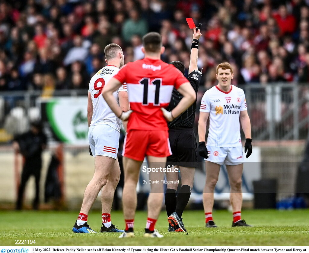 1 May 2022; Referee Paddy Neilan sends off Brian Kennedy of Tyrone during the Ulster GAA Football Senior Championship Quarter-Final match between Tyrone and Derry at O'Neills Healy Park in Omagh, Tyrone. Photo by David Fitzgerald/Sportsfile