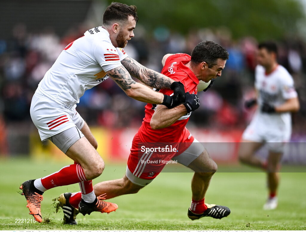 1 May 2022; Benny Heron of Derry in action against Ronan McNamee of Tyrone during the Ulster GAA Football Senior Championship Quarter-Final match between Tyrone and Derry at O'Neills Healy Park in Omagh, Tyrone. Photo by David Fitzgerald/Sportsfile