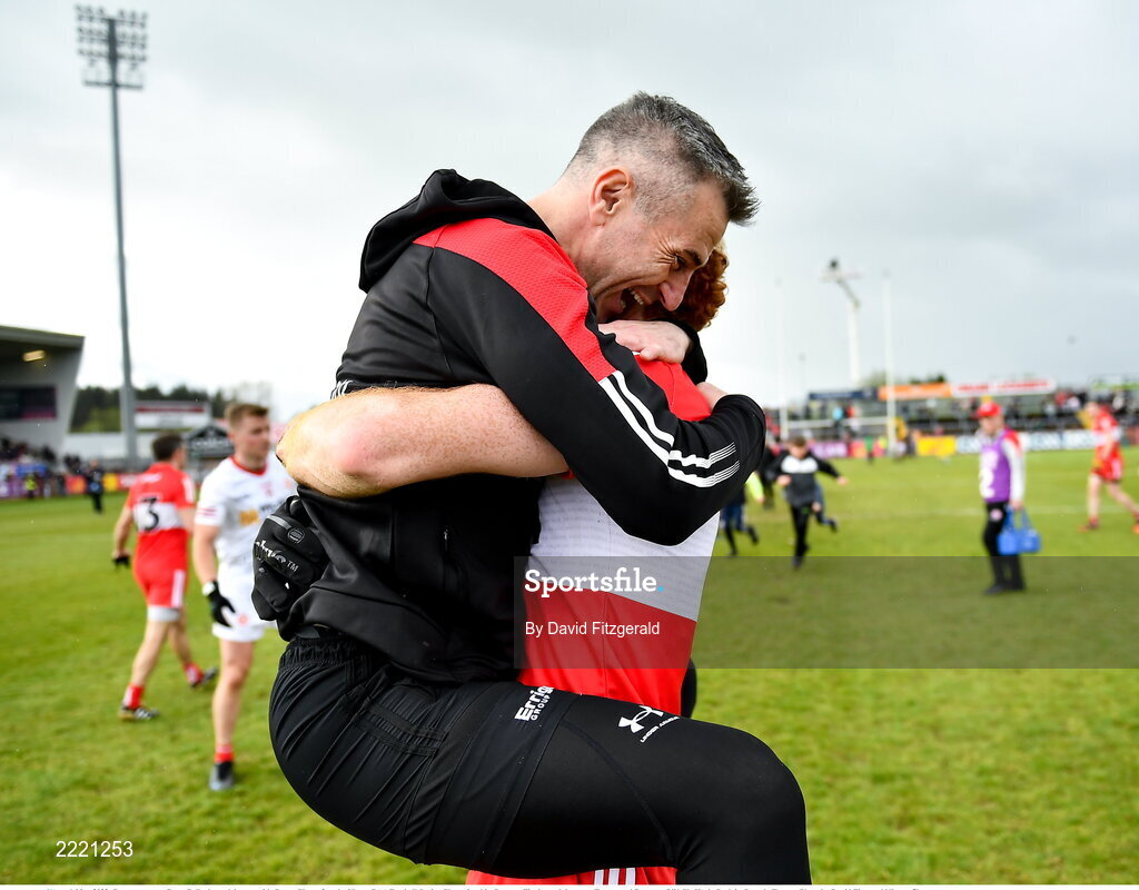 1 May 2022; Derry manager Rory Gallagher celebrates with Conor Glass after the Ulster GAA Football Senior Championship Quarter-Final match between Tyrone and Derry at O'Neills Healy Park in Omagh, Tyrone. Photo by David Fitzgerald/Sportsfile