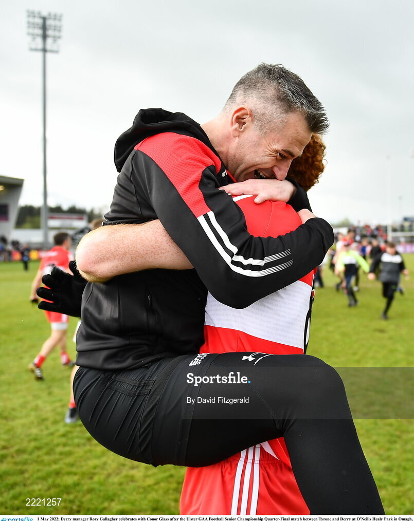 1 May 2022; Derry manager Rory Gallagher celebrates with Conor Glass after the Ulster GAA Football Senior Championship Quarter-Final match between Tyrone and Derry at O'Neills Healy Park in Omagh, Tyrone. Photo by David Fitzgerald/Sportsfile
