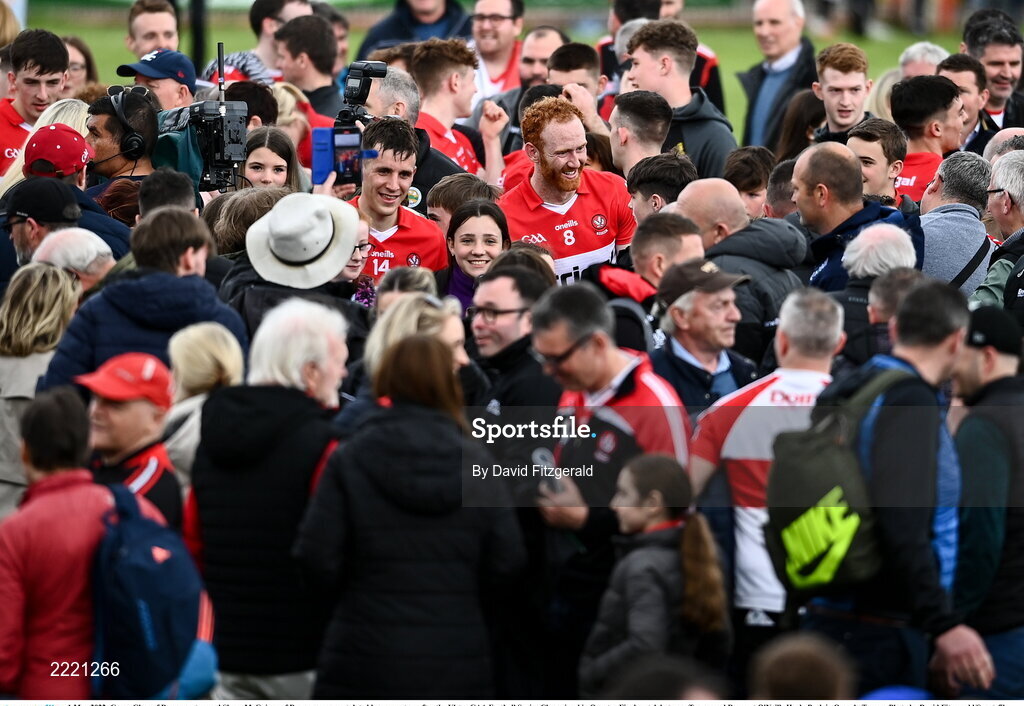 1 May 2022; Conor Glass of Derry, centre, and Shane McGuigan of Derry are congratulated by supporters after the Ulster GAA Football Senior Championship Quarter-Final match between Tyrone and Derry at O'Neills Healy Park in Omagh, Tyrone. Photo by David Fitzgerald/Sportsfile