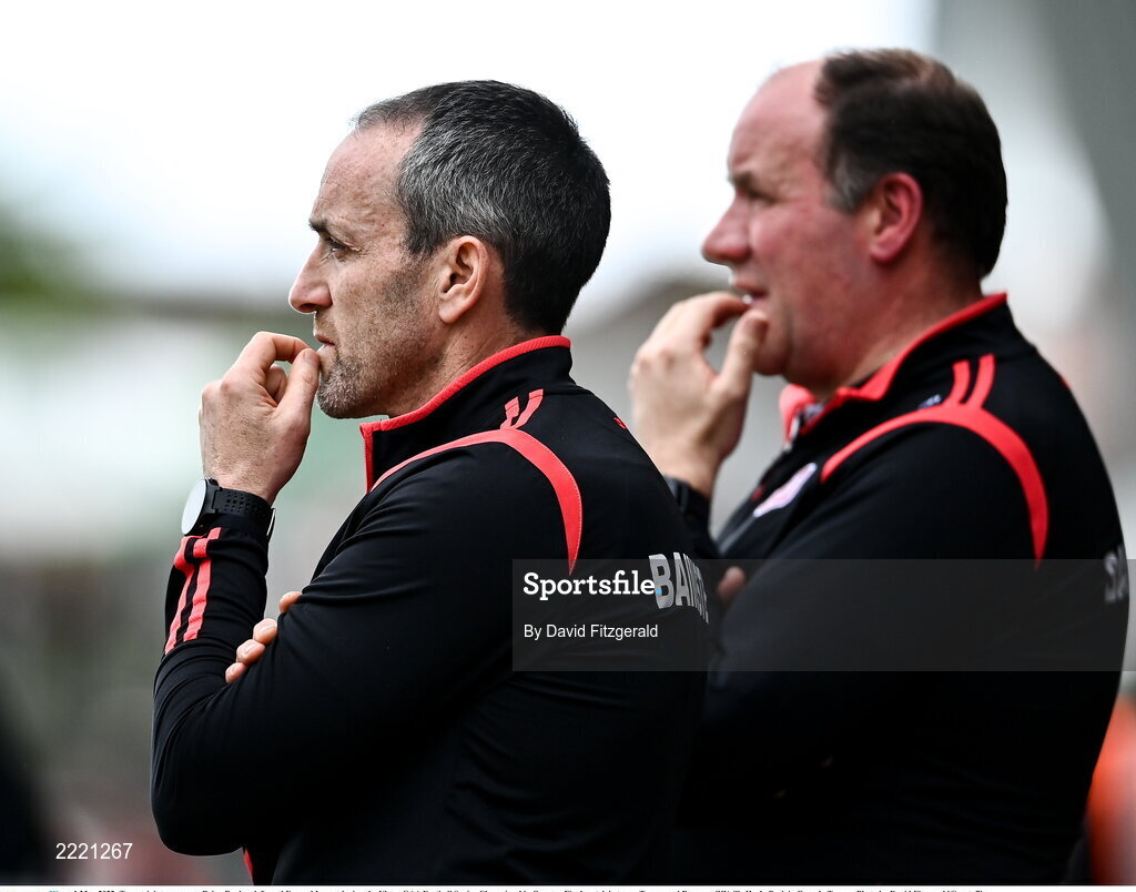 1 May 2022; Tyrone joint-managers Brian Dooher, left, and Feargal Logan during the Ulster GAA Football Senior Championship Quarter-Final match between Tyrone and Derry at O'Neills Healy Park in Omagh, Tyrone. Photo by David Fitzgerald/Sportsfile