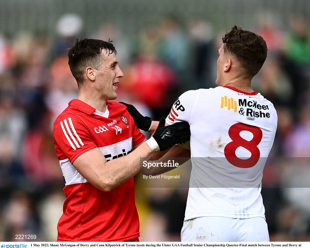 1 May 2022; Shane McGuigan of Derry and Conn Kilpatrick of Tyrone tussle during the Ulster GAA Football Senior Championship Quarter-Final match between Tyrone and Derry at O'Neills Healy Park in Omagh, Tyrone. Photo by David Fitzgerald/Sportsfile