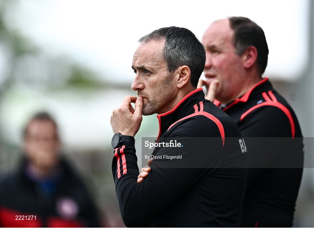 1 May 2022; Tyrone joint-managers Brian Dooher, left, and Feargal Logan during the Ulster GAA Football Senior Championship Quarter-Final match between Tyrone and Derry at O'Neills Healy Park in Omagh, Tyrone. Photo by David Fitzgerald/Sportsfile