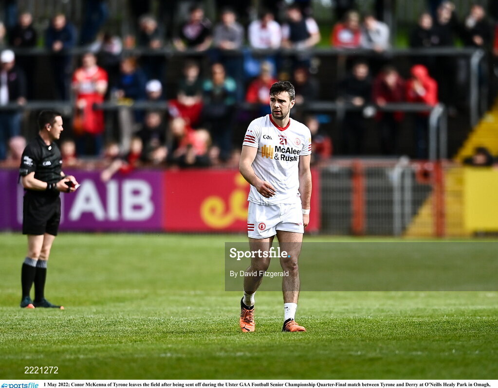 1 May 2022; Conor McKenna of Tyrone leaves the field after being sent off during the Ulster GAA Football Senior Championship Quarter-Final match between Tyrone and Derry at O'Neills Healy Park in Omagh, Tyrone. Photo by David Fitzgerald/Sportsfile