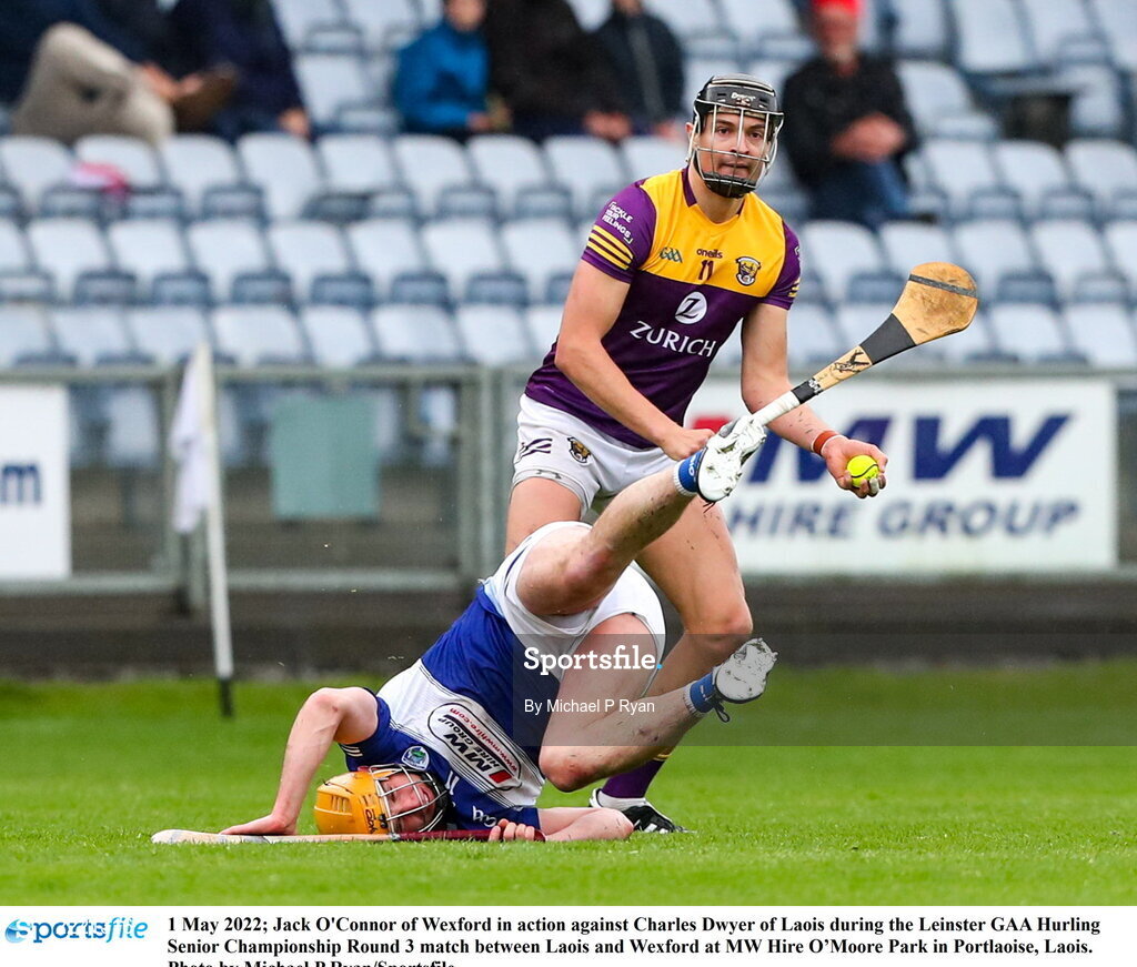 1 May 2022; Jack O'Connor of Wexford in action against Charles Dwyer of Laois during the Leinster GAA Hurling Senior Championship Round 3 match between Laois and Wexford at MW Hire O’Moore Park in Portlaoise, Laois. Photo by Michael P Ryan/Sportsfile