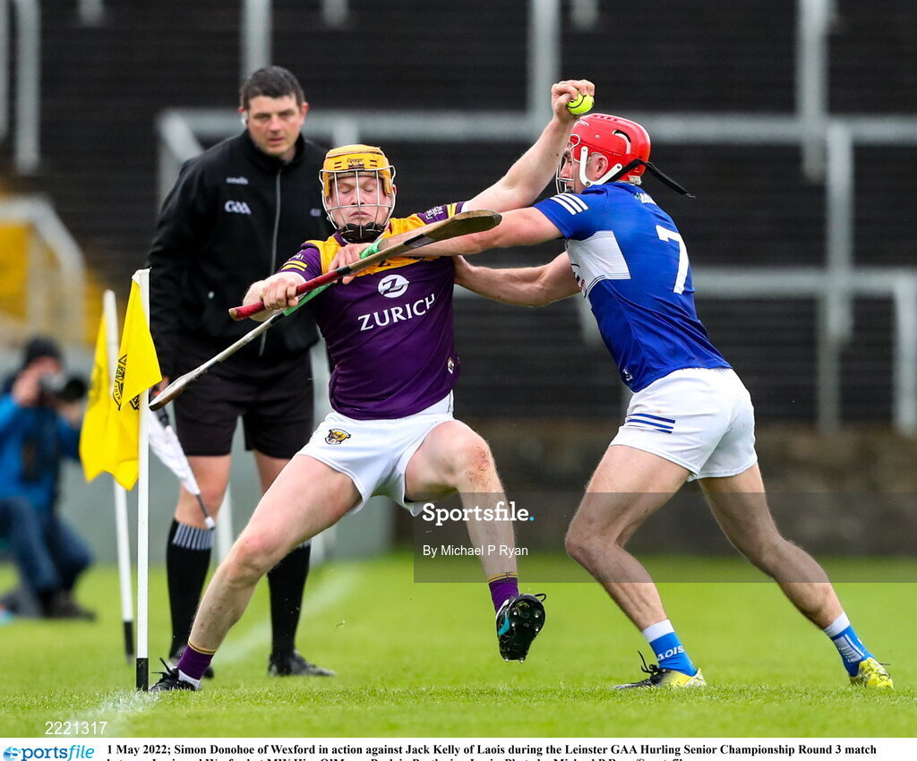 1 May 2022; Simon Donohoe of Wexford in action against Jack Kelly of Laois during the Leinster GAA Hurling Senior Championship Round 3 match between Laois and Wexford at MW Hire O’Moore Park in Portlaoise, Laois. Photo by Michael P Ryan/Sportsfile
