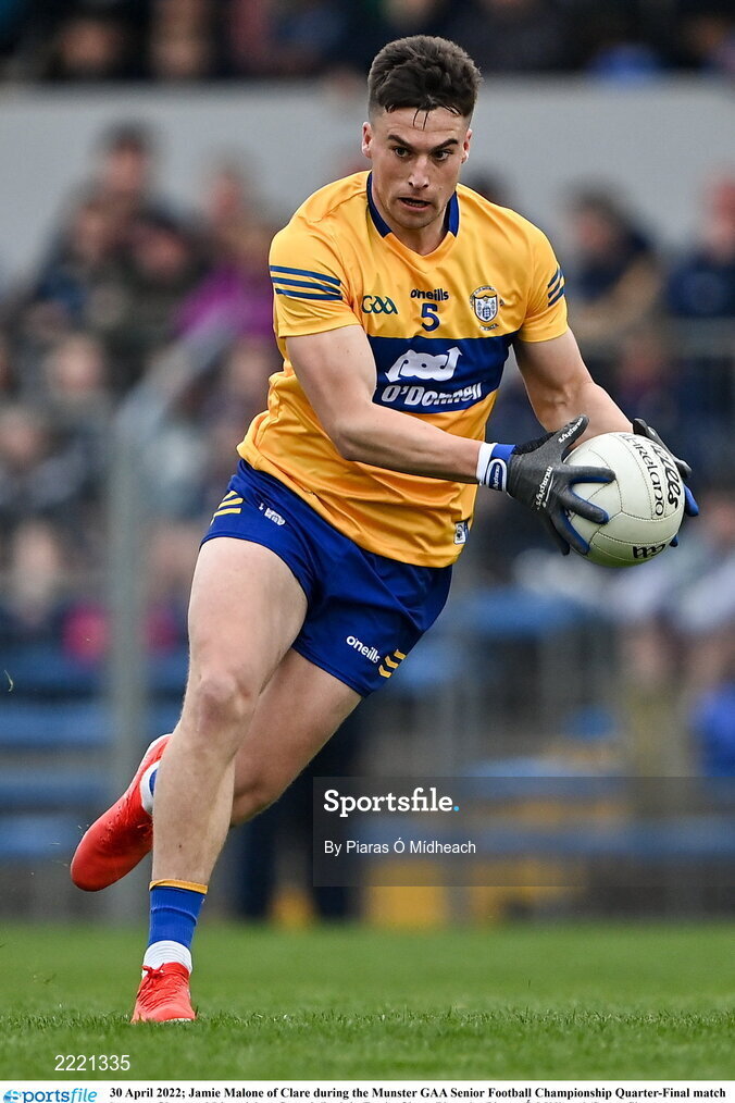 30 April 2022; Jamie Malone of Clare during the Munster GAA Senior Football Championship Quarter-Final match between Clare and Limerick at Cusack Park in Ennis, Clare. Photo by Piaras Ó Mídheach/Sportsfile
