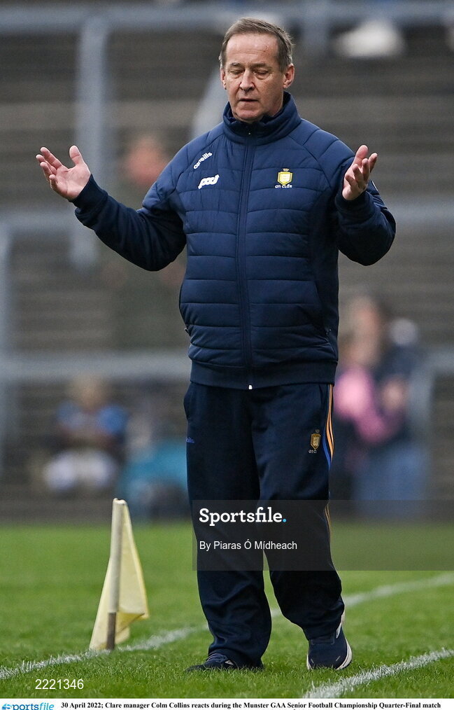 30 April 2022; Clare manager Colm Collins reacts during the Munster GAA Senior Football Championship Quarter-Final match between Clare and Limerick at Cusack Park in Ennis, Clare. Photo by Piaras Ó Mídheach/Sportsfile