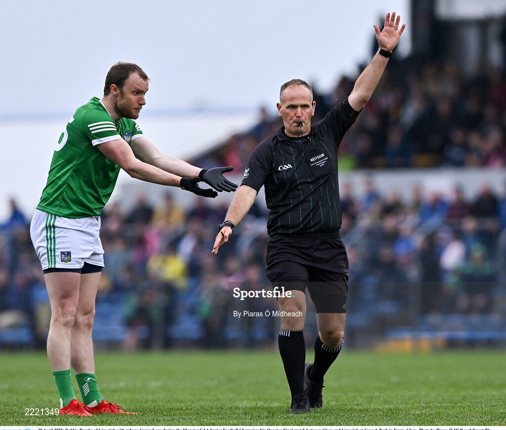 30 April 2022; Robbie Bourke of Limerick with referee Conor Lane during the Munster GAA Senior Football Championship Quarter-Final match between Clare and Limerick at Cusack Park in Ennis, Clare. Photo by Piaras Ó Mídheach/Sportsfile