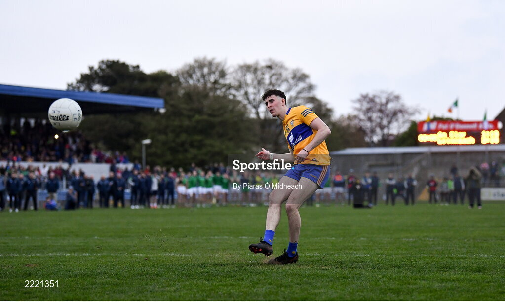 30 April 2022; Joe McGann of Clare scores his penalty in the penalty shoot-out of the Munster GAA Senior Football Championship Quarter-Final match between Clare and Limerick at Cusack Park in Ennis, Clare. Photo by Piaras Ó Mídheach/Sportsfile