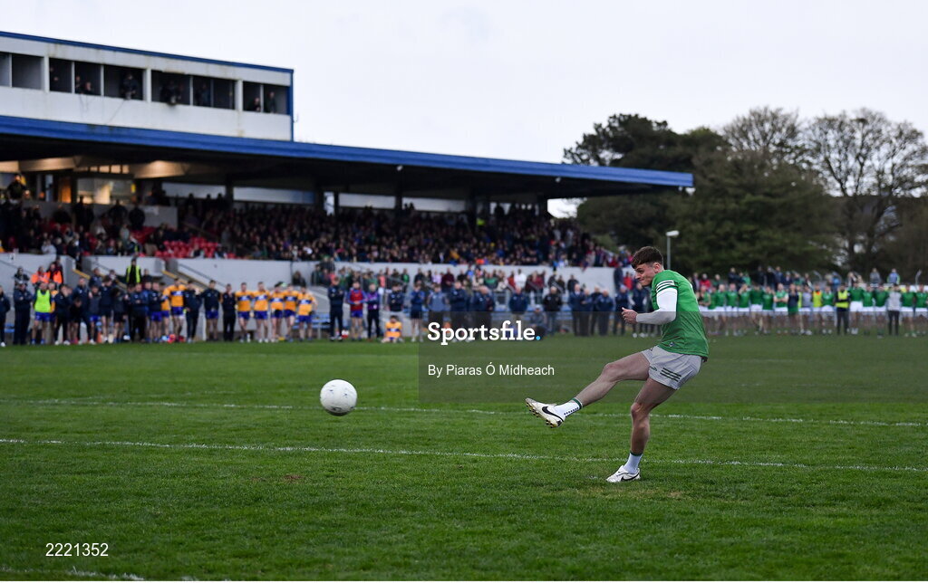 30 April 2022; Brian Donovan of Limerick scores his penalty in the penalty shoot-out of the Munster GAA Senior Football Championship Quarter-Final match between Clare and Limerick at Cusack Park in Ennis, Clare. Photo by Piaras Ó Mídheach/Sportsfile