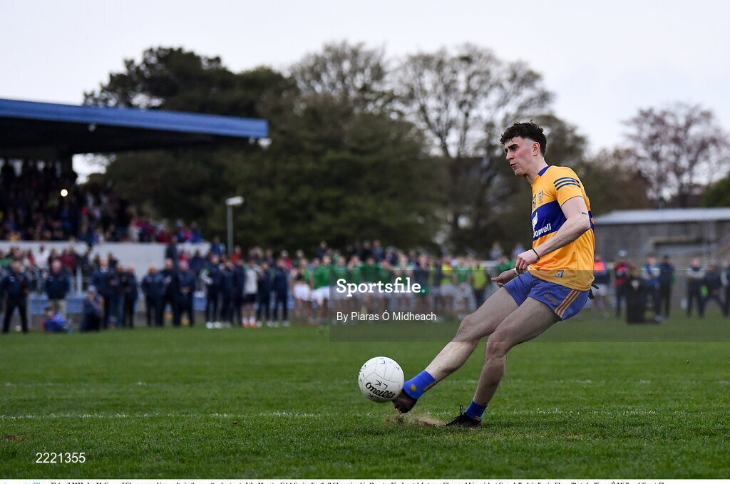 30 April 2022; Joe McGann of Clare scores his penalty in the penalty shoot-out of the Munster GAA Senior Football Championship Quarter-Final match between Clare and Limerick at Cusack Park in Ennis, Clare. Photo by Piaras Ó Mídheach/Sportsfile