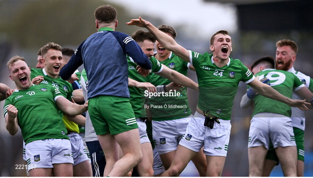 30 April 2022; Killian Ryan of Limerick, 24, celebrates with teammates after their victory in the penalty shoot-out of the Munster GAA Senior Football Championship Quarter-Final match between Clare and Limerick at Cusack Park in Ennis, Clare. Photo by Piaras Ó Mídheach/Sportsfile