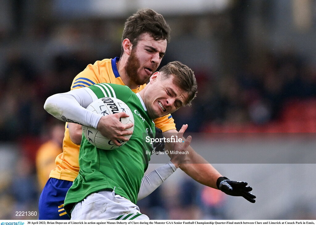 30 April 2022; Brian Donovan of Limerick in action against Manus Doherty of Clare during the Munster GAA Senior Football Championship Quarter-Final match between Clare and Limerick at Cusack Park in Ennis, Clare. Photo by Piaras Ó Mídheach/Sportsfile
