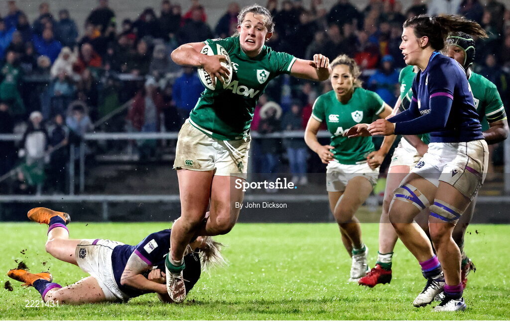 30 April 2022; Enya Breen of Ireland is tackled by Chloe Pearse of Scotland during the Tik Tok Women's Six Nations Rugby Championship match between Ireland and Scotland at Kingspan Stadium in Belfast. Photo by John Dickson/Sportsfile