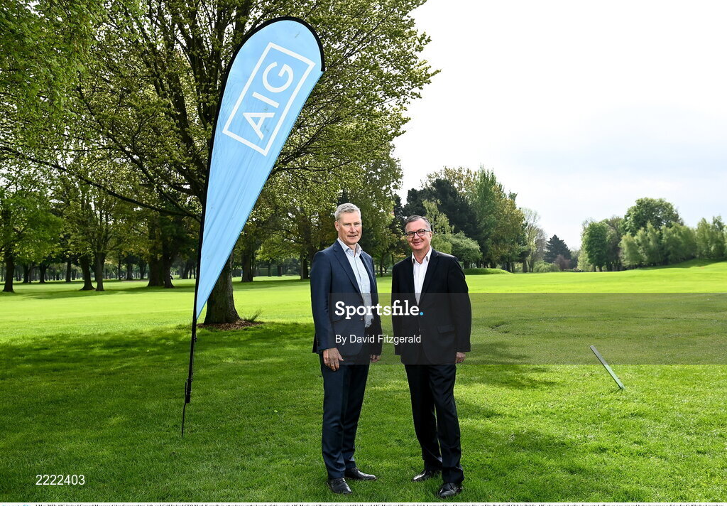 3 May 2022; AIG Ireland General Manager Aidan Connaughton, left, and Golf Ireland CEO Mark Kennelly in attendance at the launch of this year's AIG Men's and Women's Cups and Shields and AIG Men's and Women's Irish Amateur Close Championships at Elm Park Golf Club in Dublin. AIG also revealed online discounted offers on new car and home insurance policies for Golf Ireland members - for more details go to www.aig.ie/golfer or call 1800407407. Photo by David Fitzgerald/Sportsfile