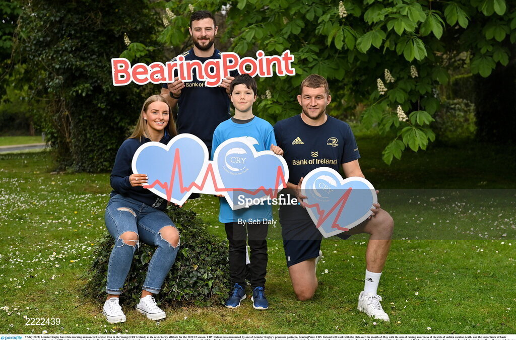 9 May 2022; Leinster Rugby have this morning announced Cardiac Risk in the Young (CRY Ireland) as its next charity affiliate for the 2021/22 season. CRY Ireland was nominated by one of Leinster Rugby’s premium partners, BearingPoint. CRY Ireland will work with the club over the month of May with the aim of raising awareness of the risk of sudden cardiac death, and the importance of basic resuscitation skills such as CPR in the community. Leinster Rugby will highlight that great work across its digital and social platforms for the month of May. For further information please check out www.cry.ie or www.leinsterrugby.ie. In attendance at the announcement are, from left, Leinster players Ciara Faulkner and Robbie Henshaw, Oliver Nursey, age 8, and Leinster player Ross Molony, at Leinster HQ in Dublin. Photo by Seb Daly/Sportsfile