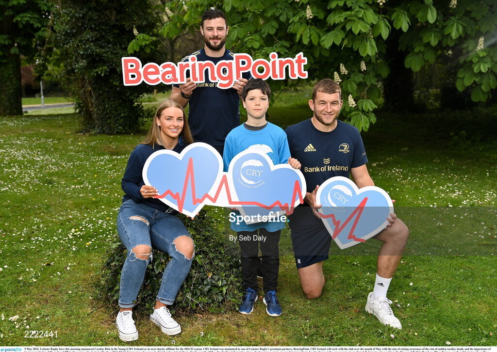 9 May 2022; Leinster Rugby have this morning announced Cardiac Risk in the Young (CRY Ireland) as its next charity affiliate for the 2021/22 season. CRY Ireland was nominated by one of Leinster Rugby’s premium partners, BearingPoint. CRY Ireland will work with the club over the month of May with the aim of raising awareness of the risk of sudden cardiac death, and the importance of basic resuscitation skills such as CPR in the community. Leinster Rugby will highlight that great work across its digital and social platforms for the month of May. For further information please check out www.cry.ie or www.leinsterrugby.ie. In attendance at the announcement are, from left, Leinster players Ciara Faulkner and Robbie Henshaw, Oliver Nursey, age 8, and Leinster player Ross Molony, at Leinster HQ in Dublin. Photo by Seb Daly/Sportsfile