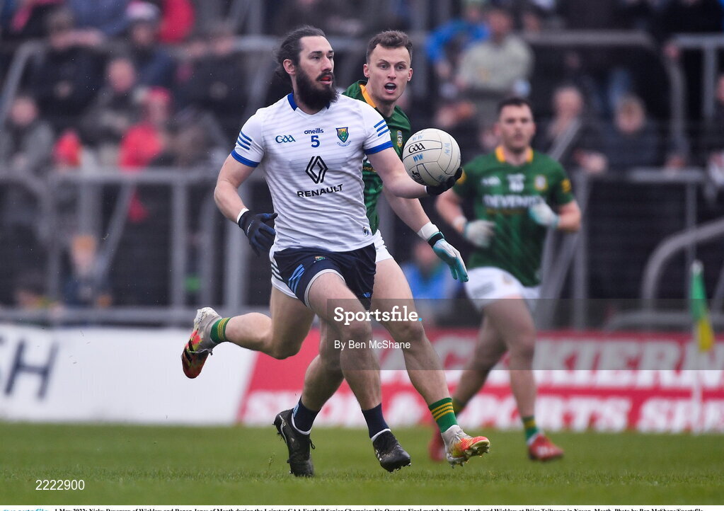 1 May 2022; Nicky Devereux of Wicklow and Ronan Jones of Meath during the Leinster GAA Football Senior Championship Quarter-Final match between Meath and Wicklow at Páirc Tailteann in Navan, Meath. Photo by Ben McShane/Sportsfile