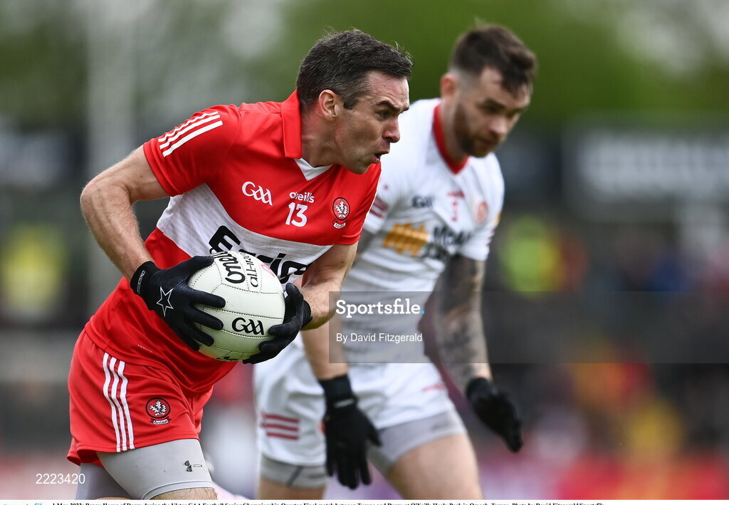 1 May 2022; Benny Heron of Derry during the Ulster GAA Football Senior Championship Quarter-Final match between Tyrone and Derry at O'Neills Healy Park in Omagh, Tyrone. Photo by David Fitzgerald/Sportsfile