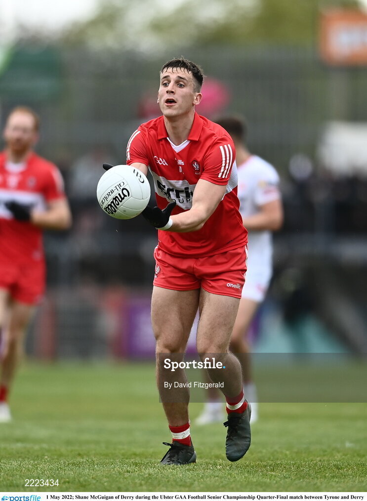1 May 2022; Shane McGuigan of Derry during the Ulster GAA Football Senior Championship Quarter-Final match between Tyrone and Derry at O'Neills Healy Park in Omagh, Tyrone. Photo by David Fitzgerald/Sportsfile
