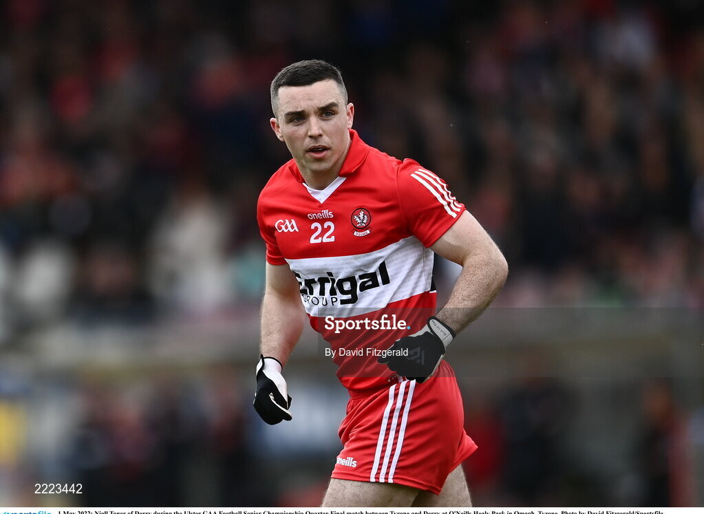 1 May 2022; Niall Toner of Derry during the Ulster GAA Football Senior Championship Quarter-Final match between Tyrone and Derry at O'Neills Healy Park in Omagh, Tyrone. Photo by David Fitzgerald/Sportsfile