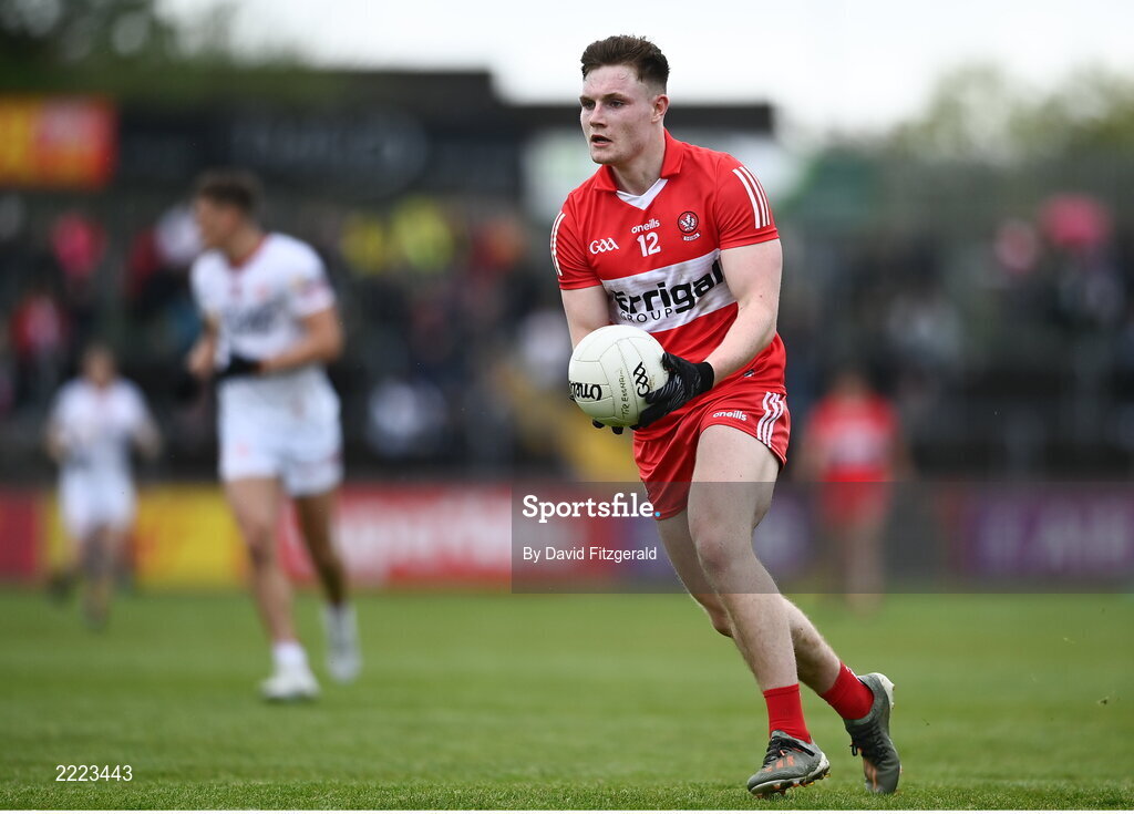 1 May 2022; Ethan Doherty of Derry during the Ulster GAA Football Senior Championship Quarter-Final match between Tyrone and Derry at O'Neills Healy Park in Omagh, Tyrone. Photo by David Fitzgerald/Sportsfile