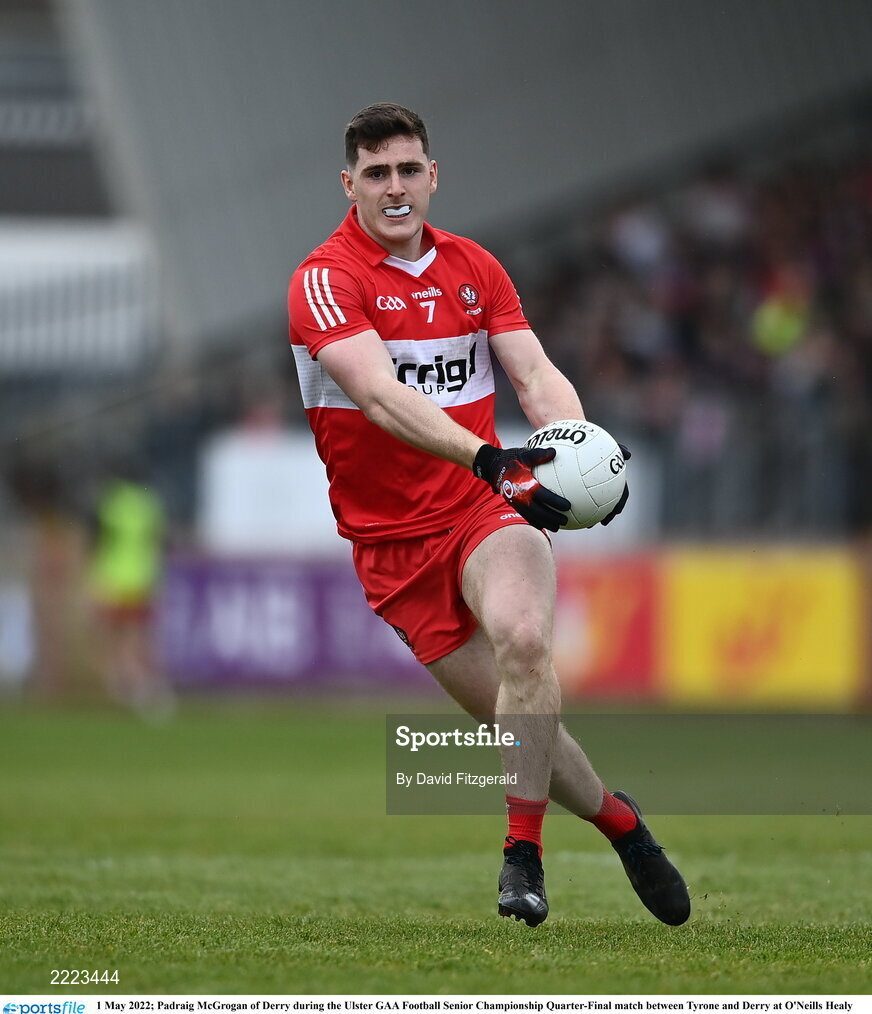 1 May 2022; Padraig McGrogan of Derry during the Ulster GAA Football Senior Championship Quarter-Final match between Tyrone and Derry at O'Neills Healy Park in Omagh, Tyrone. Photo by David Fitzgerald/Sportsfile