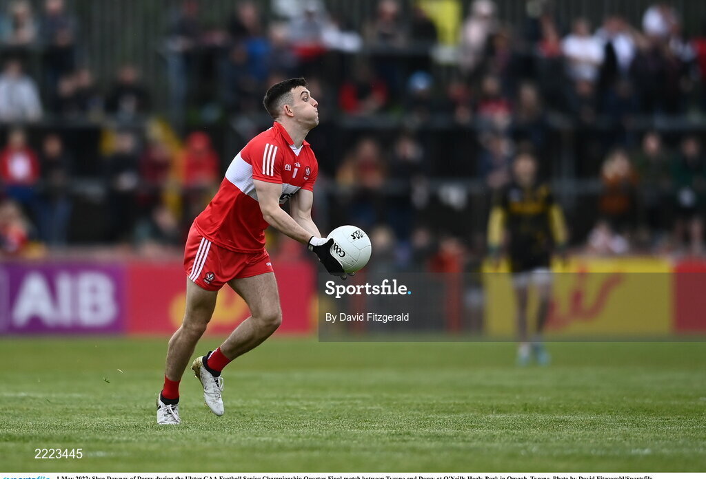 1 May 2022; Shea Downey of Derry during the Ulster GAA Football Senior Championship Quarter-Final match between Tyrone and Derry at O'Neills Healy Park in Omagh, Tyrone. Photo by David Fitzgerald/Sportsfile