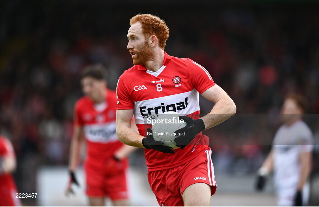 1 May 2022; Conor Glass of Derry during the Ulster GAA Football Senior Championship Quarter-Final match between Tyrone and Derry at O'Neills Healy Park in Omagh, Tyrone. Photo by David Fitzgerald/Sportsfile
