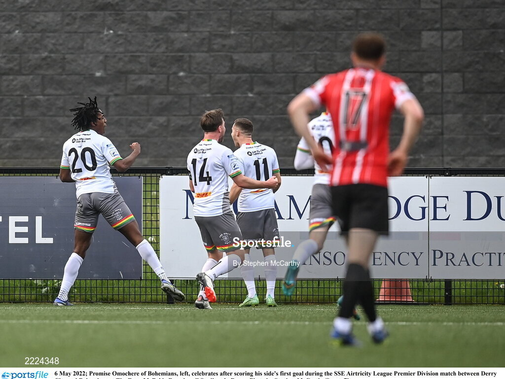 6 May 2022; Promise Omochere of Bohemians, left, celebrates after scoring his side's first goal during the SSE Airtricity League Premier Division match between Derry City and Bohemians at The Ryan McBride Brandywell Stadium in Derry. Photo by Stephen McCarthy/Sportsfile