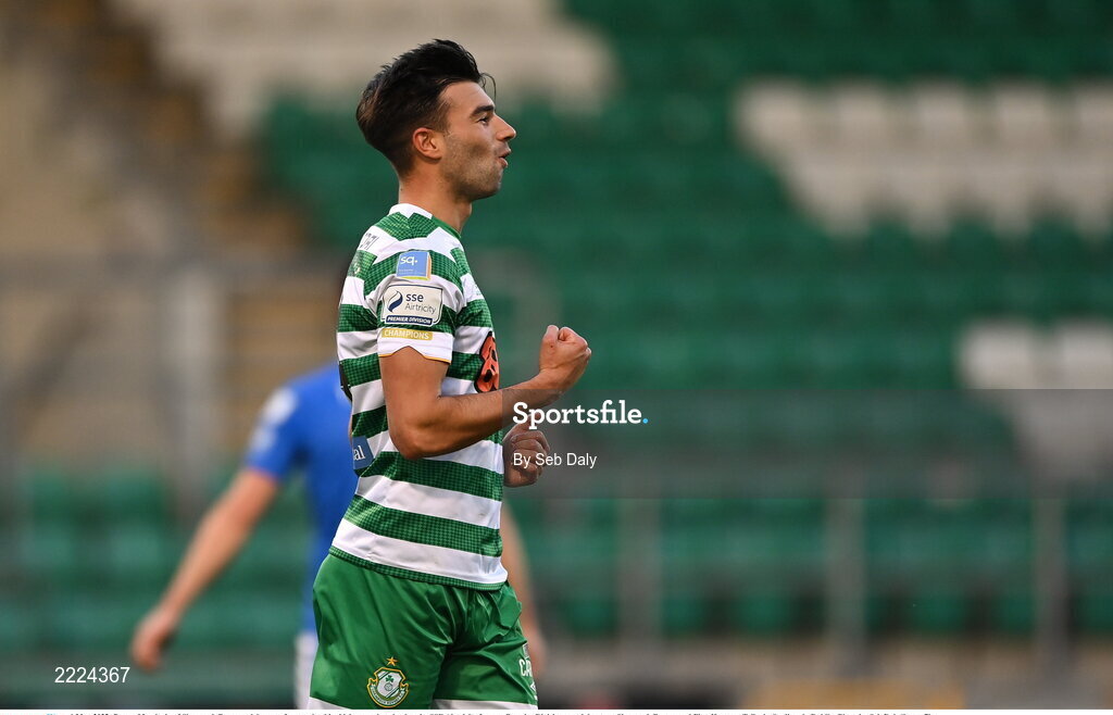 6 May 2022; Danny Mandroiu of Shamrock Rovers celebrates after scoring his side's second goal during the SSE Airtricity League Premier Division match between Shamrock Rovers and Finn Harps at Tallaght Stadium in Dublin. Photo by Seb Daly/Sportsfile
