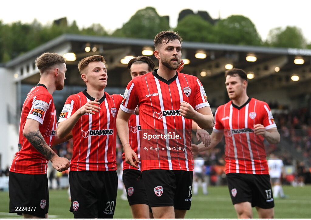 6 May 2022; Will Patching of Derry City celebrates with team-mates after scoring their side's first goal during the SSE Airtricity League Premier Division match between Derry City and Bohemians at The Ryan McBride Brandywell Stadium in Derry. Photo by Stephen McCarthy/Sportsfile
