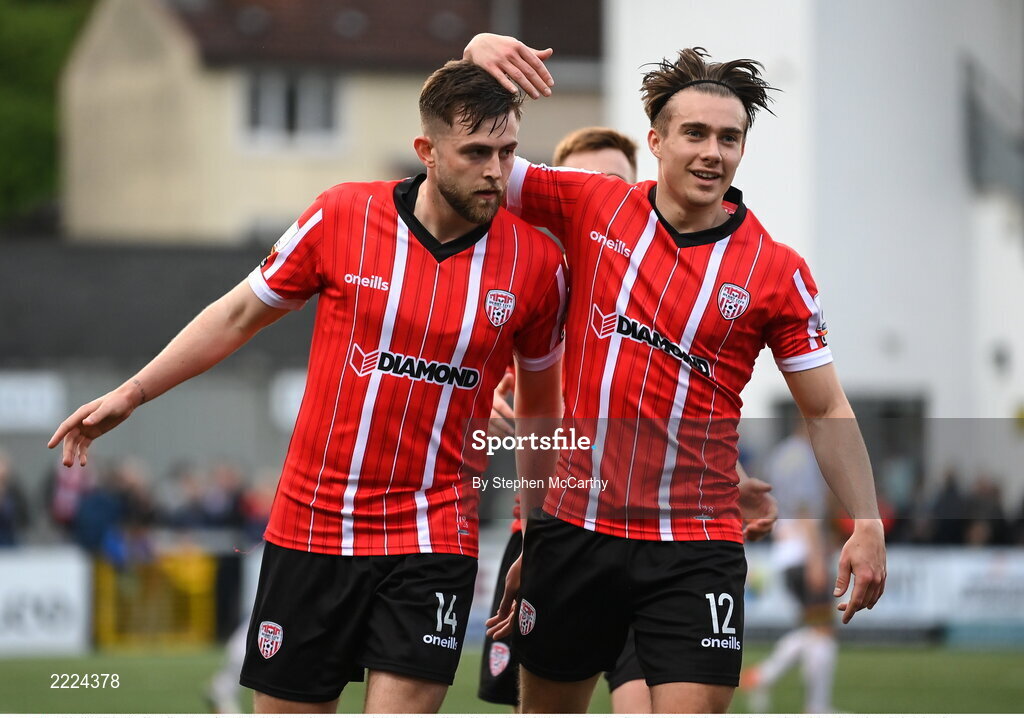 6 May 2022; Will Patching of Derry City celebrates after scoring his side's first goal with team-mate Matty Smith, right, during the SSE Airtricity League Premier Division match between Derry City and Bohemians at The Ryan McBride Brandywell Stadium in Derry. Photo by Stephen McCarthy/Sportsfile