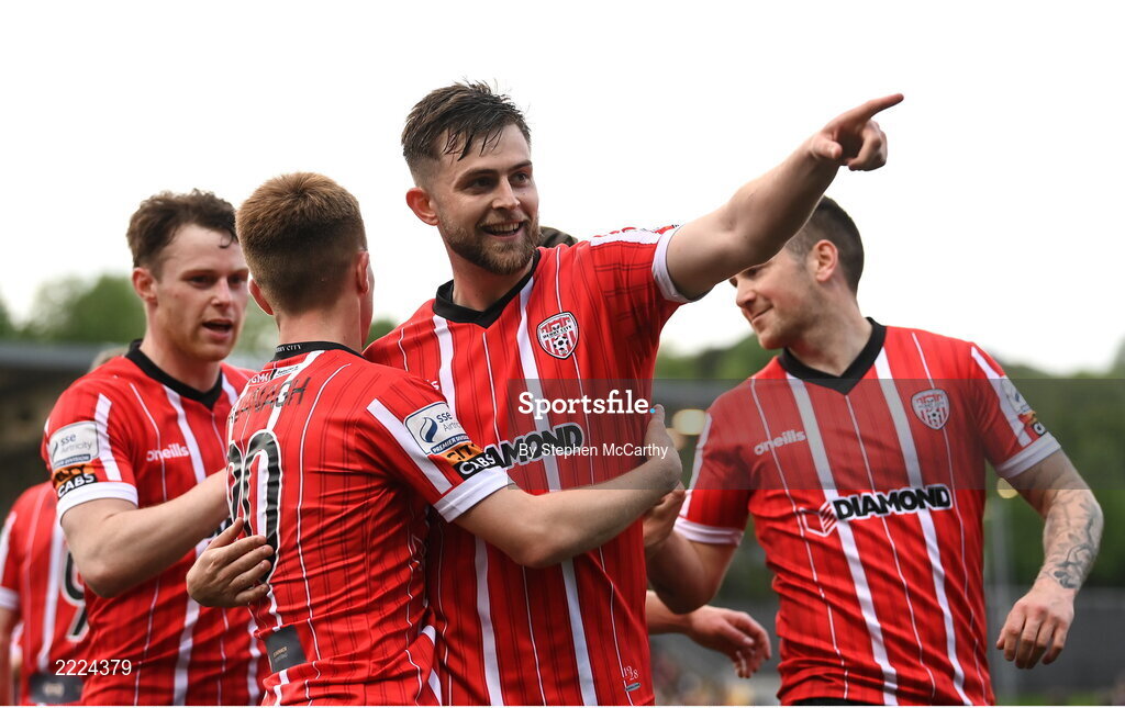 6 May 2022; Will Patching of Derry City celebrates with team-mates after scoring their side's first goal during the SSE Airtricity League Premier Division match between Derry City and Bohemians at The Ryan McBride Brandywell Stadium in Derry. Photo by Stephen McCarthy/Sportsfile