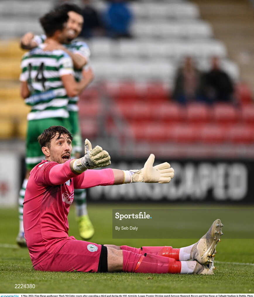 6 May 2022; Finn Harps goalkeeper Mark McGinley reacts after conceding a third goal during the SSE Airtricity League Premier Division match between Shamrock Rovers and Finn Harps at Tallaght Stadium in Dublin. Photo by Seb Daly/Sportsfile