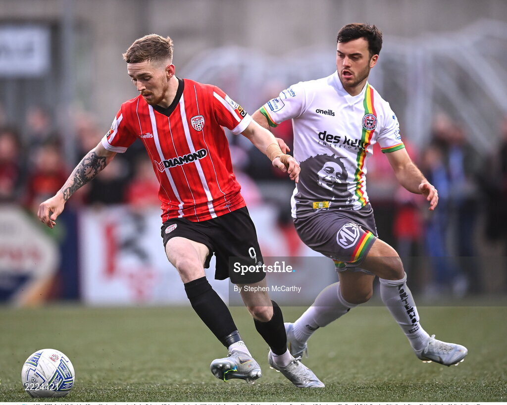 6 May 2022; Jamie McGonigle of Derry City in action against Jordan Doherty of Bohemians during the SSE Airtricity League Premier Division match between Derry City and Bohemians at The Ryan McBride Brandywell Stadium in Derry. Photo by Stephen McCarthy/Sportsfile