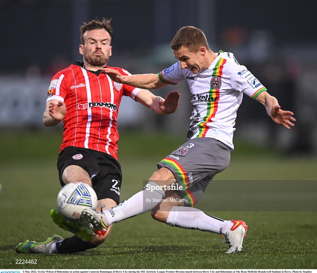 6 May 2022; Tyreke Wilson of Bohemians in action against Cameron Dummigan of Derry City during the SSE Airtricity League Premier Division match between Derry City and Bohemians at The Ryan McBride Brandywell Stadium in Derry. Photo by Stephen McCarthy/Sportsfile