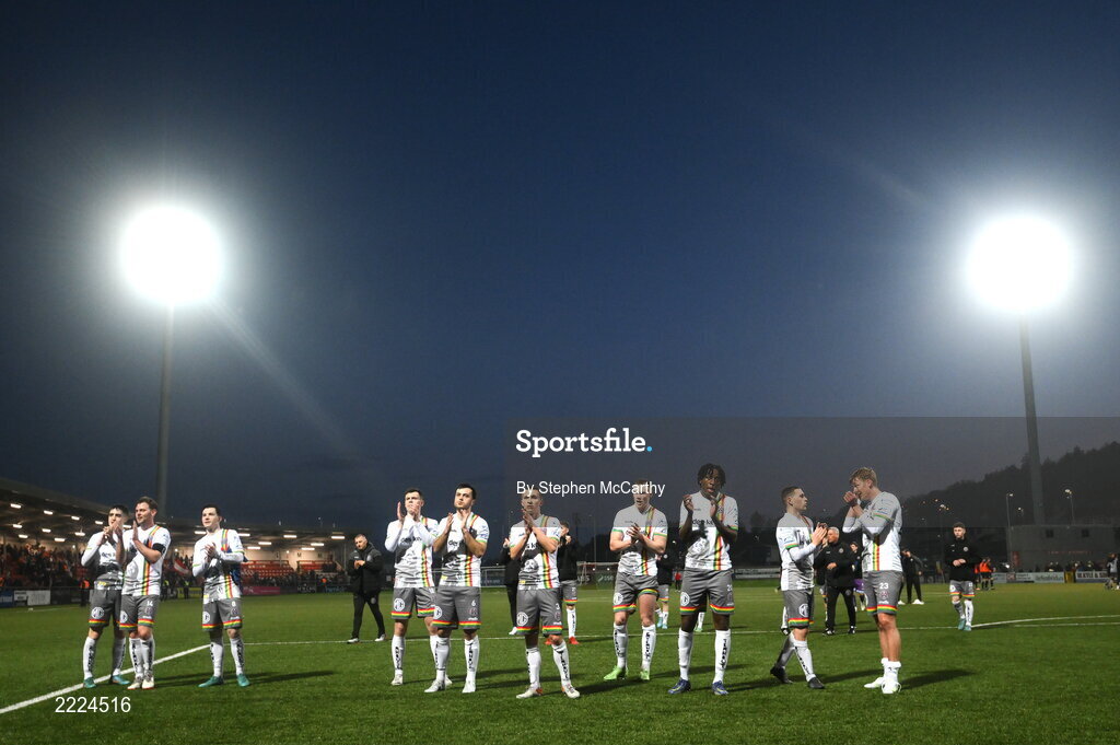 6 May 2022; Bohemians players applaud their supporters after the SSE Airtricity League Premier Division match between Derry City and Bohemians at The Ryan McBride Brandywell Stadium in Derry. Photo by Stephen McCarthy/Sportsfile