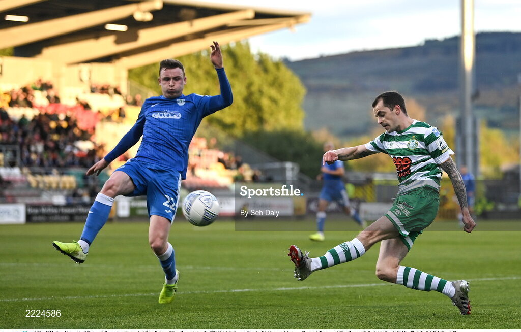 6 May 2022; Sean Kavanagh of Shamrock Rovers in action against Ryan Rainey of Finn Harps during the SSE Airtricity League Premier Division match between Shamrock Rovers and Finn Harps at Tallaght Stadium in Dublin. Photo by Seb Daly/Sportsfile