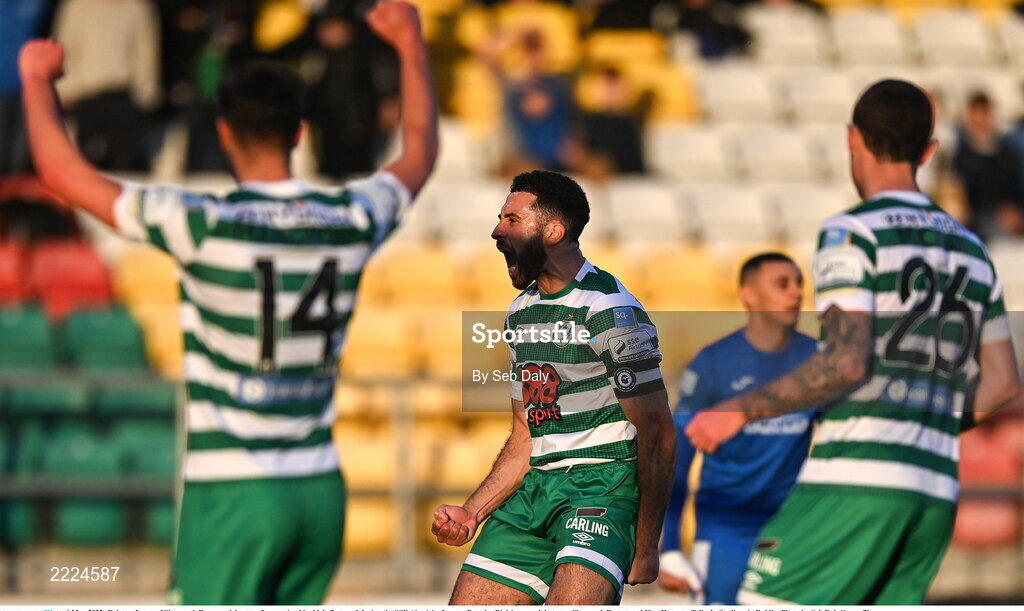6 May 2022; Roberto Lopes of Shamrock Rovers celebrates after scoring his side's first goal during the SSE Airtricity League Premier Division match between Shamrock Rovers and Finn Harps at Tallaght Stadium in Dublin. Photo by Seb Daly/Sportsfile