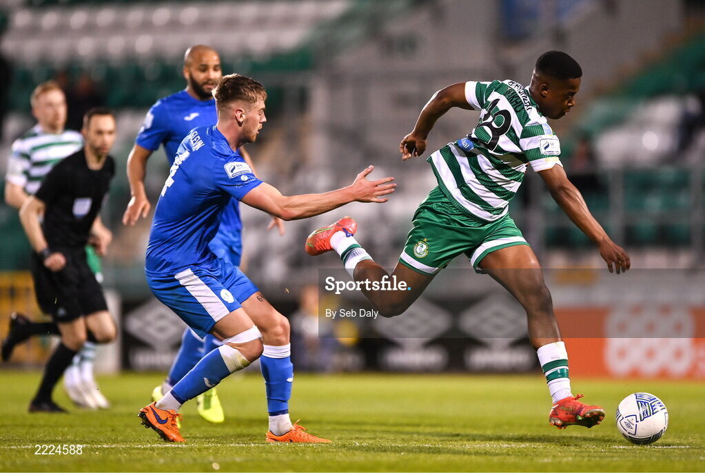 6 May 2022; Aidomo Emakhu of Shamrock Rovers in action against Rob Slevin of Finn Harps during the SSE Airtricity League Premier Division match between Shamrock Rovers and Finn Harps at Tallaght Stadium in Dublin. Photo by Seb Daly/Sportsfile