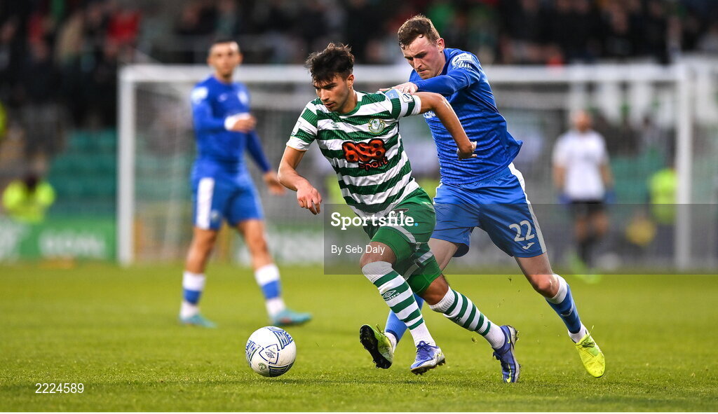 6 May 2022; Danny Mandroiu of Shamrock Rovers in action against Ryan Rainey of Finn Harps during the SSE Airtricity League Premier Division match between Shamrock Rovers and Finn Harps at Tallaght Stadium in Dublin. Photo by Seb Daly/Sportsfile