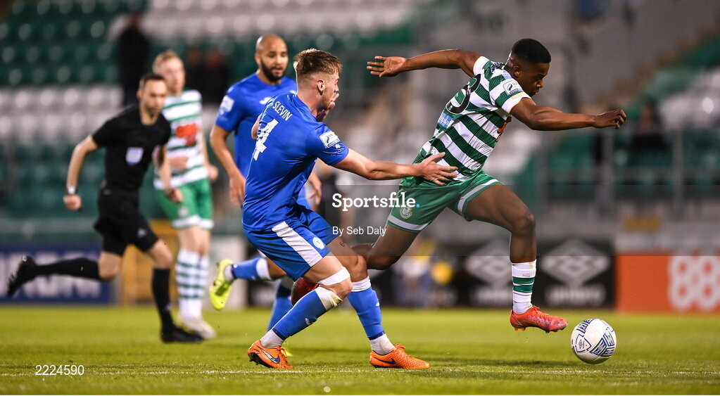 6 May 2022; Aidomo Emakhu of Shamrock Rovers in action against Rob Slevin of Finn Harps during the SSE Airtricity League Premier Division match between Shamrock Rovers and Finn Harps at Tallaght Stadium in Dublin. Photo by Seb Daly/Sportsfile
