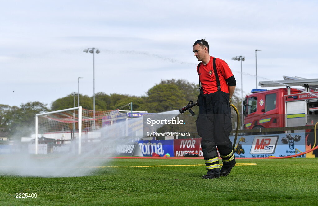 29 April 2022; Colm McGowan, member of the Sligo County Fire Brigade, waters the pitch before the SSE Airtricity League Premier Division match between Sligo Rovers and Shamrock Rovers at The Showgrounds in Sligo. Photo by Piaras Ó Mídheach/Sportsfile