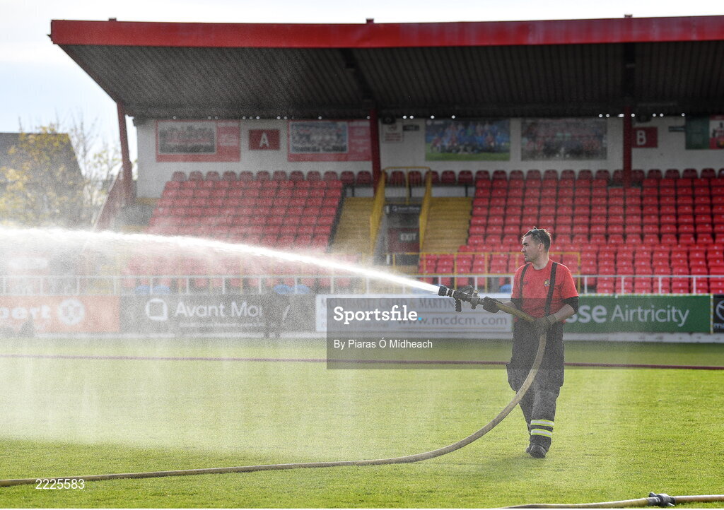 29 April 2022; Colm McGowan, member of the Sligo County Fire Brigade, waters the pitch before the SSE Airtricity League Premier Division match between Sligo Rovers and Shamrock Rovers at The Showgrounds in Sligo. Photo by Piaras Ó Mídheach/Sportsfile